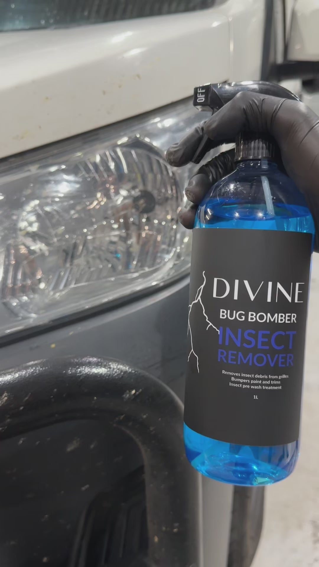 DIVINE BUG BOMBER Insect Remover is an industrial-strength formula specifically designed to effortlessly break down and remove insect debris, bug splatter, and road grime. Unlike traditional soaps or generic cleaners that struggle with tough organic residues, BUG BOMBER penetrates and dissolves stubborn insect remains without damaging your vehicle’s paint, glass, or trim.