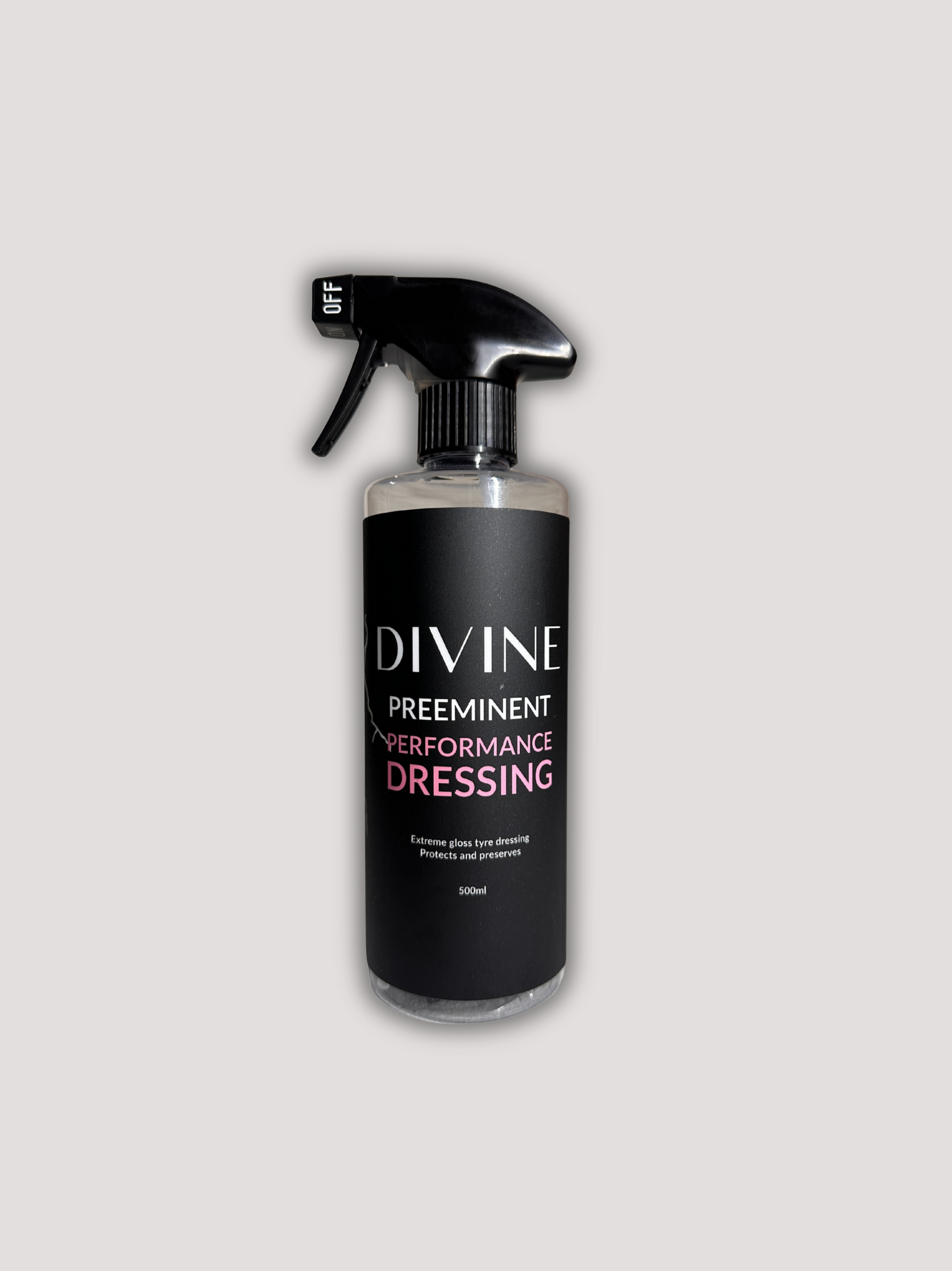 DIVINE PREEMINENT Performance Dressing is a high-performance, water-based formula designed to deliver superior protection and shine to tyres, rubber, vinyl, and leather surfaces. Unlike conventional dressings that fade quickly or leave a greasy residue, PREEMINENT is engineered to condition, soften, preserve, and protect while maintaining a long-lasting, glossy finish.