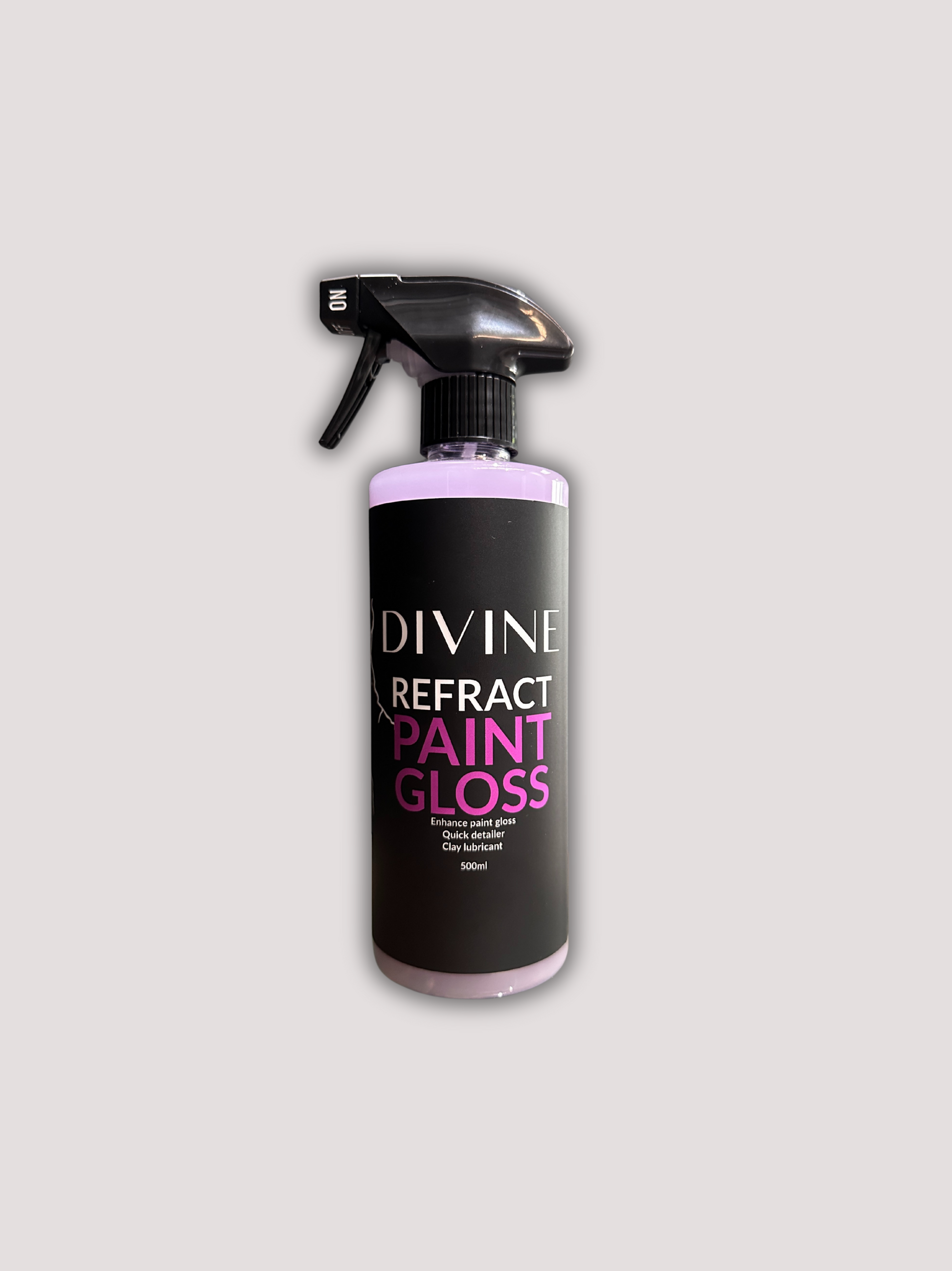 DIVINE REFRACT Paint Gloss is a high-performance, water-based detailing spray designed to instantly enhance and protect your vehicle’s paintwork. Unlike traditional quick detailers, REFRACT not only removes light dirt, dust, and smudges but also adds a brilliant, streak-free shine while acting as a lubricant for clay bar treatments.